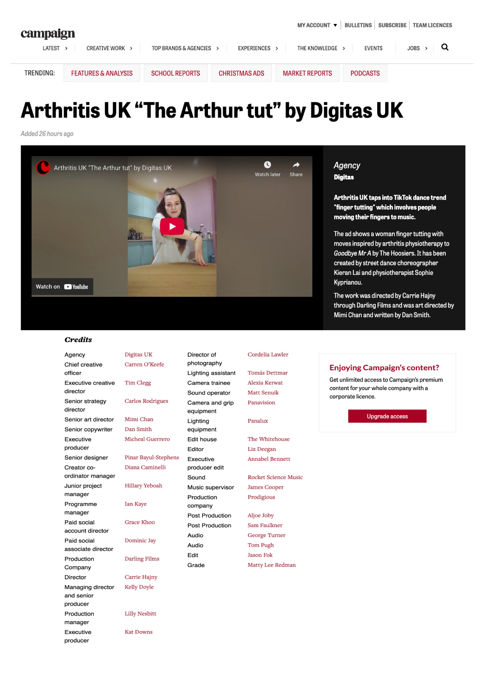 Arthritis UK "The Arthur tut" wins 'Campaign's' Ad Of the Day